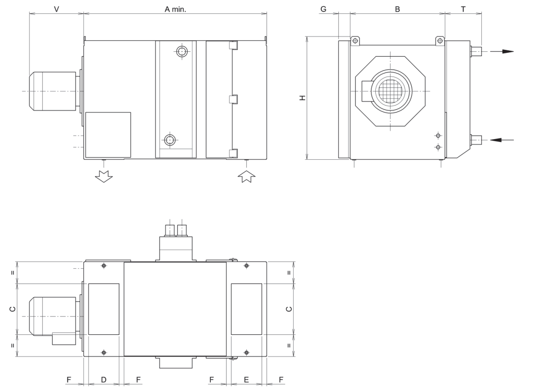| Kind | Power (kW) | A (mm) | B (mm) | C (mm) | D (mm) | E (mm) | F (mm) | G (mm) | H (mm) | T (mm) | V (mm) | Engine power Fan (kW) | Water flow (l/h) | Water connections |